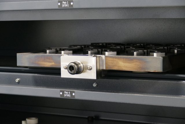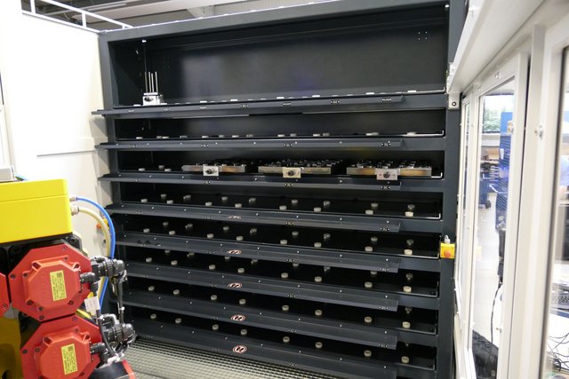 Die Paletten für beide Spannarten werden vom Bediener direkt an der Automationszelle auf einem der beiden Rüstplätze bestückt. Anschlüsse für Schrauber und Luftpistole sind direkt am Rüstplatz vorhanden. Ein zusätzliches Handeln der schweren Paletten entfällt somit. Nach dem Bestücken werden die Paletten vom Roboter in ein Palettenregal eingelagert. In Summe können 32 Paletten bevorratet werden. Beim Einlagern teilt der Bediener dem Roboter auch direkt mit, welches Bauteil sich auf der Palette befindet, worüber dann beim Beladen das passende Bearbeitungsprogramm ausgewählt wird-