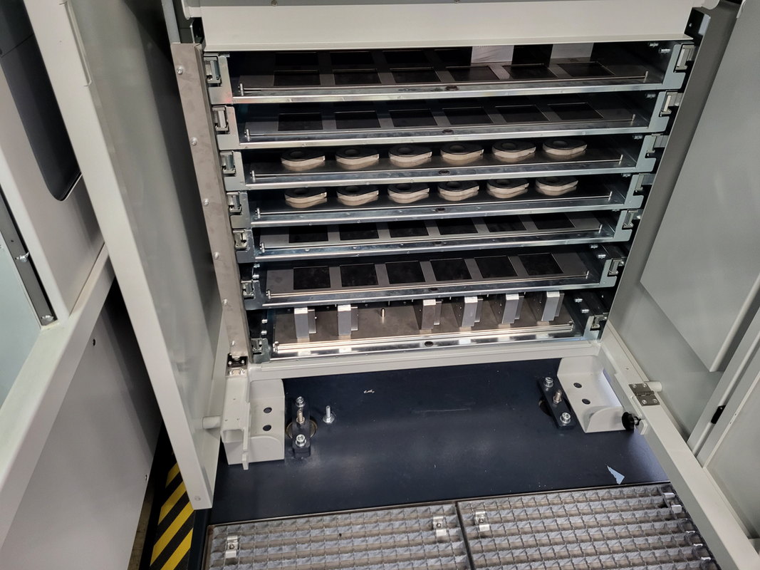 Entscheidend war für Herrn Salwasser die einfache Handhabung der Roboterzelle, um den Schritt zum Invest in diesem Projekt zu gehen. Der Bediener gibt lediglich einige Parameter ein. Anschließend erkennt der Roboter automatisch das passende Spannmittel, positioniert die Spannbacken, entnimmt das Rohteil aus der Schublade, übergibt Spannmittel und Werkstück an die Maschine und startet das passende CNC-Programm. Danach übergibt der Roboter das Bauteil in ein 2. Spannmittel, so dass die Rückseite ebenfalls bearbeitet werden kann – eine vollständig automatisierte 6-Seiten Bearbeitung.