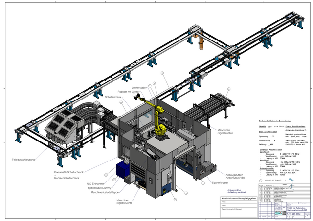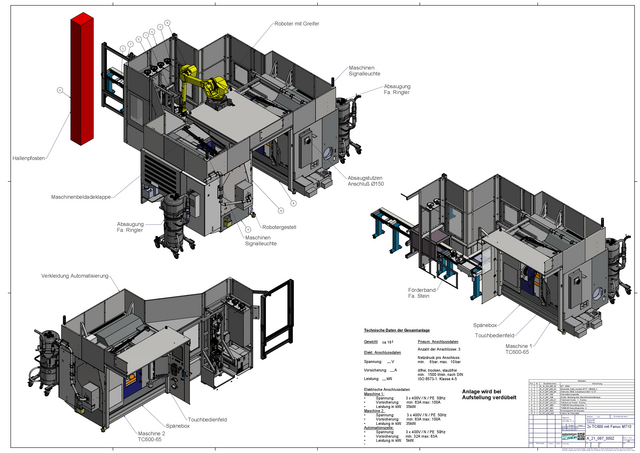 Hauptschwerpunkte bei der Auslegung der Anlagen waren die Themen der Anbindung der Anlagen an die restliche Fertigung inkl. des vorgesehenen Fördersystems mit codierten Warentägern wie auch die Einhaltung des Gesamttakts der Fertigung, was nur mit jeweils 2 Maschinen pro Prozessschritt denkbar war.